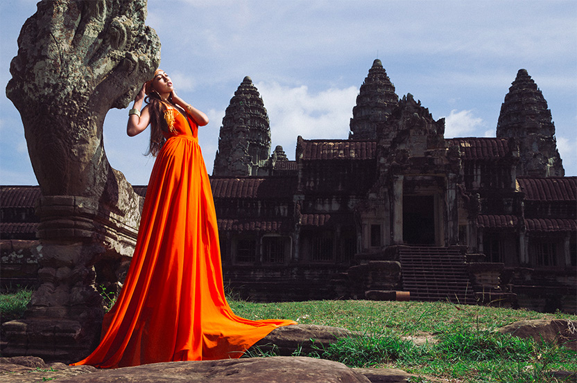 西元802年由蘇耶跋摩二世舉全國之力,以砂石岩建造了約30多年,作為國廟或自己的陵墓,進入主建築前,引道兩旁有不少的那迦Naga雕刻及石獅子,象徵王權力量及守護,引道旁的荷花池及護城河是精密的水利系統的見證,西面共有五道門,最左邊和最右邊是民眾及動物進出,中間的門是國王貴族在進出,吳哥寺的建築象徵了當時宗教的世界觀,五座主塔由三層迴廊環繞而成,周邊的護城河比擬成大海,中間的高塔是眾神的居所,這也是在暹粒市有個規定,所有的房屋建築高度都不可以超過吳哥窟。