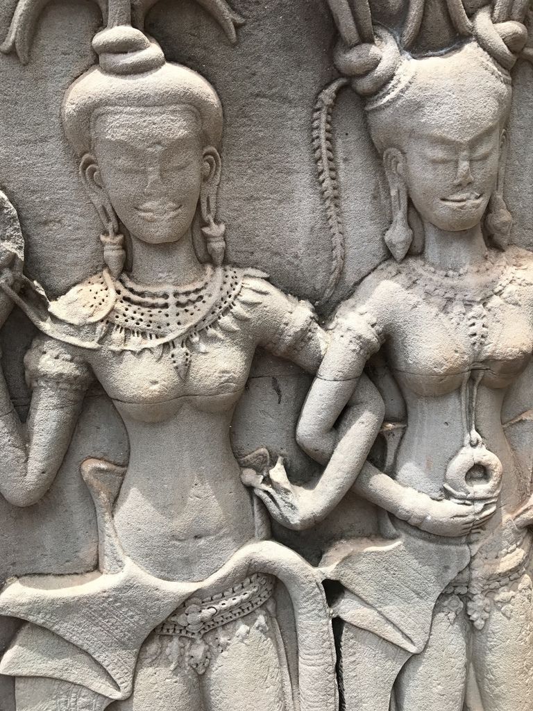順著迴廊往上走,會發現有些窗戶雕花,保存得完好,頭頂上的迴廊石頭堆疊,據說是沒有使用黏土,採用了雙層岩堆疊工法,與底下的岩柱分散拱頂重量,巧妙了找到支撐點,聽當地友人及導遊說,順著拱頂迴廊的交會,會在一處的交界處,找到世界的中心點,當把手機裡的羅盤打開,奇妙的竟然顯示''0''。一、二、三層的迴廊牆壁上,刻滿了精細的浮雕壁畫,壁畫內非常多宗教史詩故事,''翻騰乳海''是我最喜歡的壁畫之一,在第三層迴廊可以看到,講述善神與惡神翻攪著海水求取長生不老藥,攪拌的過程誕生了無數的仙女及生命,所以在小吳哥裡有著許多仙女雕刻,每個仙女衣著及神情都不竟相同,