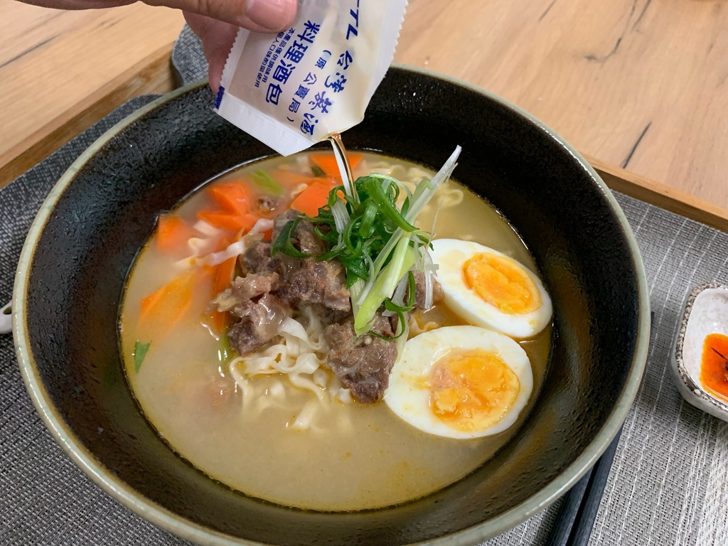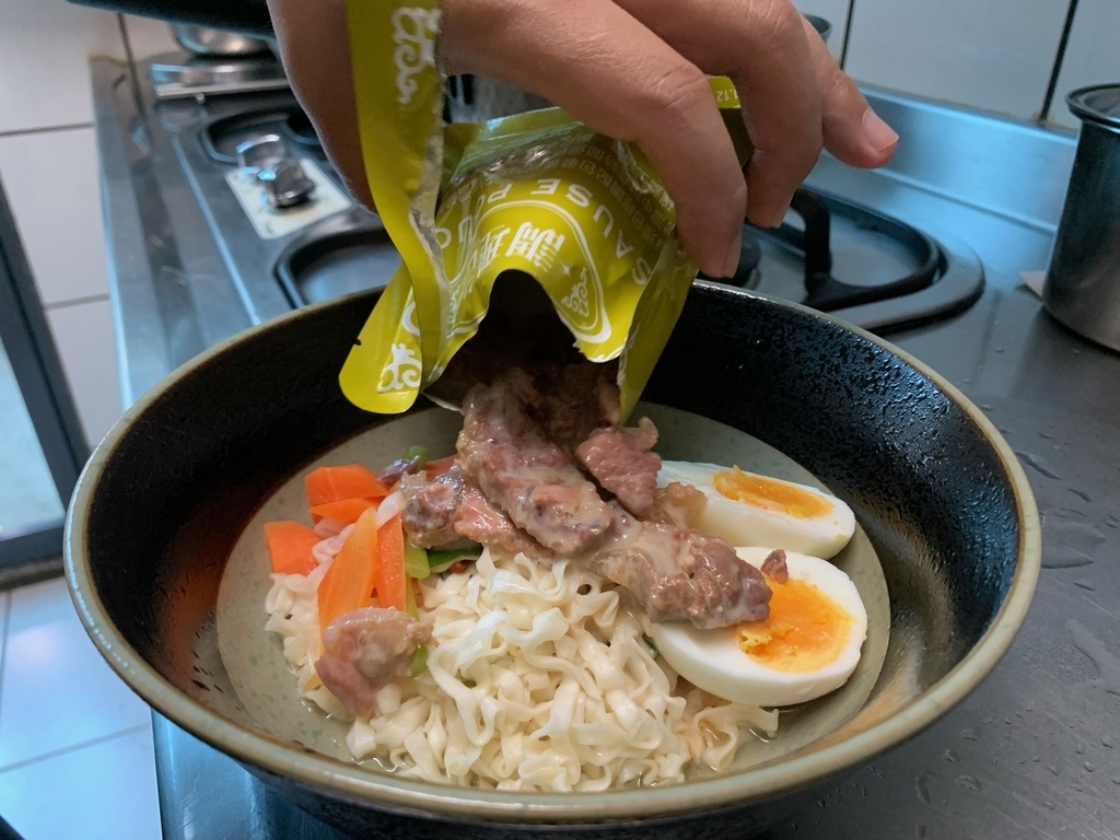 調理包的牛肉塊,是細火慢燉飽滿牛肉塊,肉質軟嫩不柴,份量也不少,堪稱是泡麵料理包裡的模範生