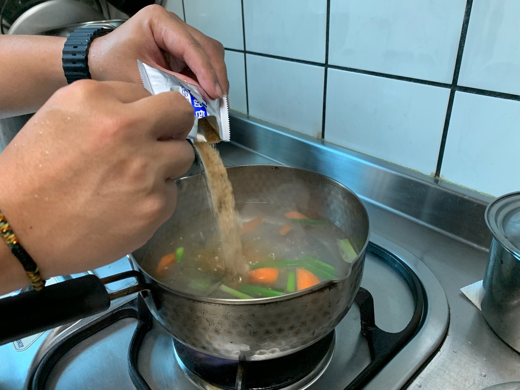 滾鍋熱水加入紅蘿蔔及蔥,放入調料包及油包,把湯頭的底打好