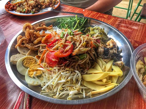 泰國人說這是一道很傳統料理,中間是涼拌木瓜搭配各式醃菜跟炸豬皮