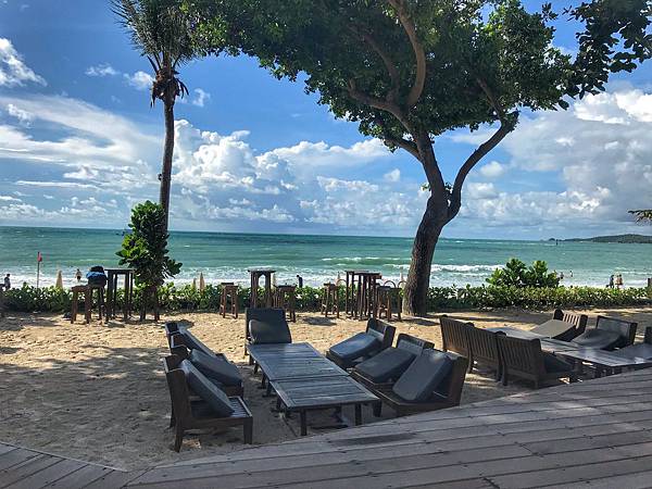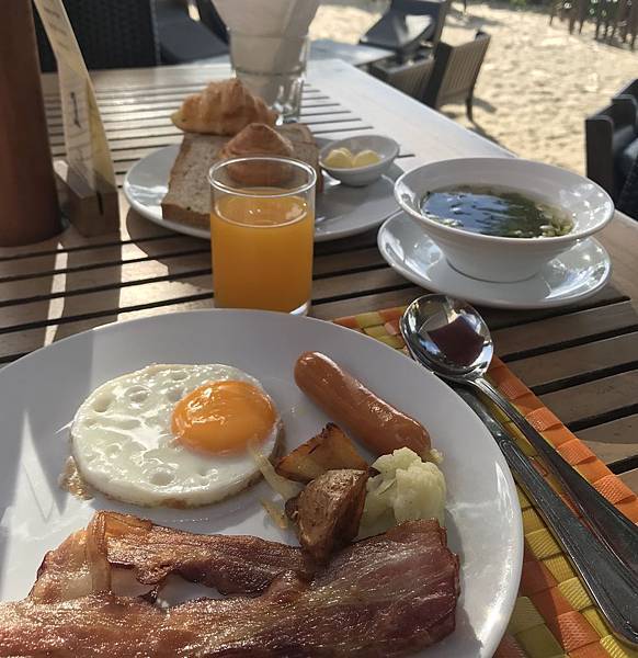 有沒有人這麼覺得,出門旅行在外,不管前一晚多累,或喝到爛醉,早上都必須起來吃一頓早餐,享受那種偷懶慵懶的節奏,尤其又有海景的陪襯,聽著海浪的聲音、海風吹過椰子樹的聲音,接著用刀叉劃過盤子那兩顆荷包蛋,濃郁的蛋黃流出,滿分